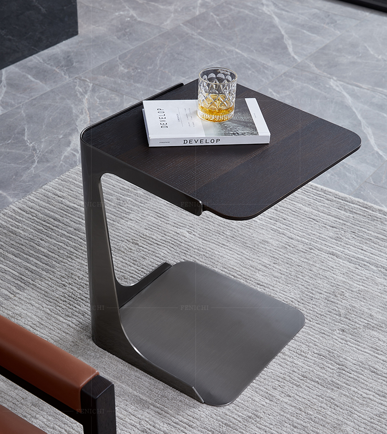 フィニはその意味式のきわめて簡単な角のいくつかのソファーのそばの小さいテーブルのC型の辺の後で近代的なステンレスの小さい方のいくつかの置物のテーブルの煙の薫製の木【辺の何】のイタリア式はきわめて簡単です。